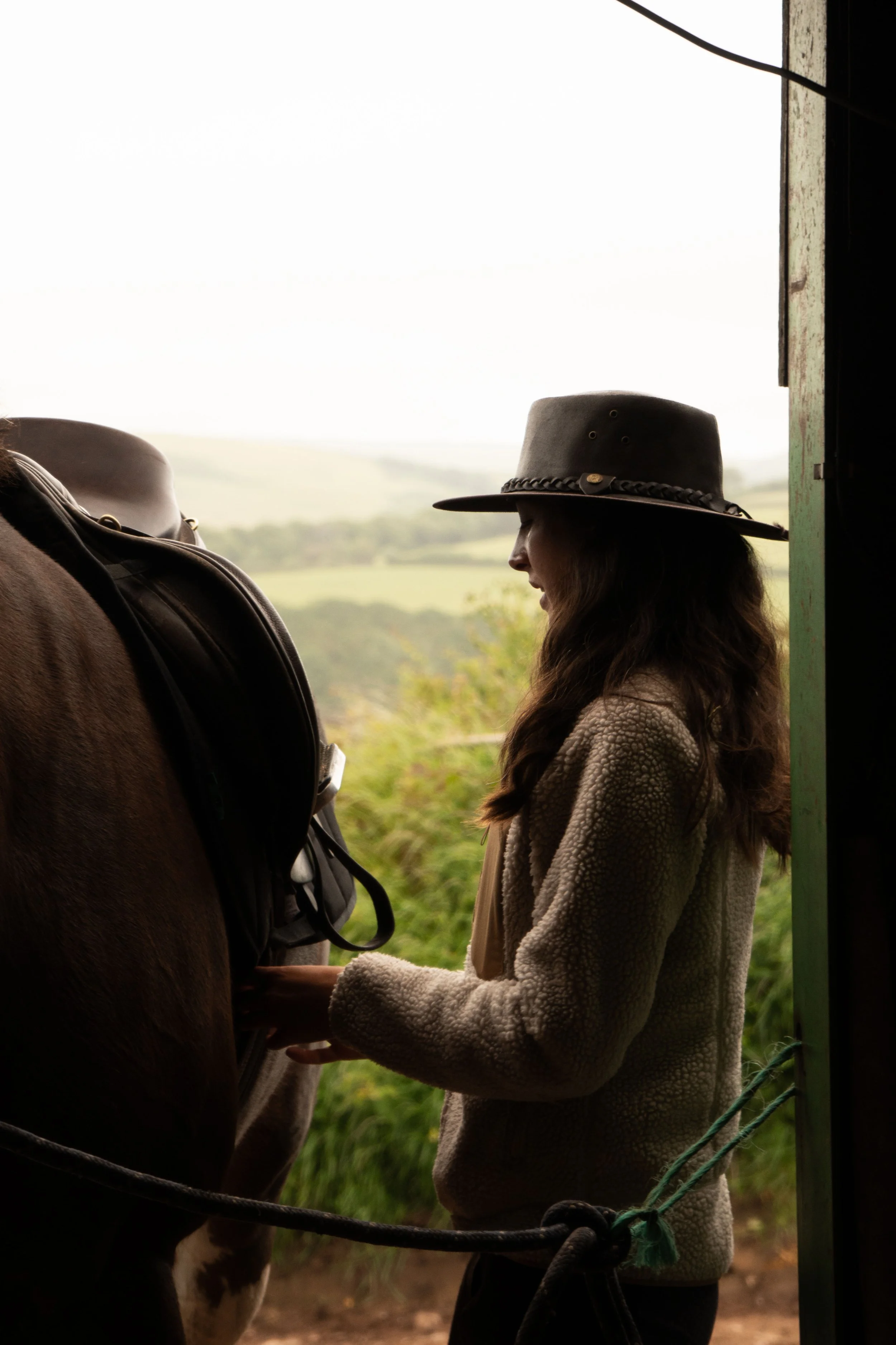 Short for Budweiser. A sleek half-Clydesdale, half-Thoroughbred mare, now doused in citronella and packed-up to the gunnels. She’s proud, and rightly so: sharp, resilient, and extremely sassy. The kind of horse that would thunder you into battle like a titan. What she lacks in humility, she makes up for in strength; trail hardened and unerring under pressure. Bud, understandably, was reluctant to part from her herd. But her wariness began to ease after our first test: an irksome detour forced by a road closure, leading us over a narrow stone bridge (scarcely wider than a smuggler’s cart) while the valley echoed with the clamour of machinery. I kept steady, and Bud, true to form, held her nerve. We pressed on, passing Roman fortlets, weathered sandstone outcrops, and the tidal pools of Woody Bay. On one side, the path dropped into an evergreen, Amazonian-like gorge-choked by mist, before collapsing into the restless waters of the Severn Estuary. After an unrelenting procession of hills, we reached camp, where Danni was readying hay and water. Bud had a stable beside the field, but Danni couldn’t resist tying her up nearby, wanting her to feel the nearness of those semi-familiar.